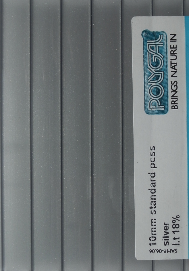 Сотовый поликарбонат Polygal PolyShade производится с особым металлическим покрытием, усиливающим затеняющий эффект. Специальный пигмент, содержащийся в этом покрытии, обеспечивает оптимальный уровень отражения солнечного излучения с особым «металлическим» блеском покрытия.